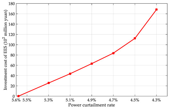 It can be seen from Figure 17 that with the reduction of the power curtailment rate, it is necessary to configure larger capacity EES, which increases the investment cost. In addition, when the power curtailment rate is reduced to around 4.5%, the curve appears nonlinear, which means that when the power curtailment rate drops to a certain extent, to further improve the accommodation effect, it is necessary to configure incrementally larger capacity for the EES.