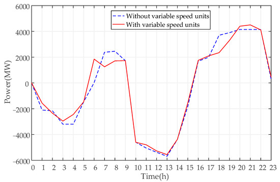 It can be seen from the figure that after adding the variable speed units, the power under the pumping condition is significantly reduced. Specifically analyzing the optimization results, from 13:00 to 14:00, the original curtailed power during this period was 5560.15 MW·h. In the case of conventional units, the total pumping power of the PSH power station is 5690 MW; after adding the variable-speed unit, the total pumping power of the PSH power station is 5560.15 MW, which realizes the compensation of pumping power without deviation, which saves 129.85 MW of pumping power consumption compared with the conventional unit. Considering the total pumping power of the whole day, without adding variable speed units, the total pumping power of the PSH power station on that day is 39,039.24 MW; after adding variable speed units, the total pumping power is 36,958.32 MW. A total of 2080.92 MW of pumping power was saved on that day. Considering the long-period power station operation, the variable speed unit will bring considerable energy savings, which verifies the necessity of adding the variable speed unit.