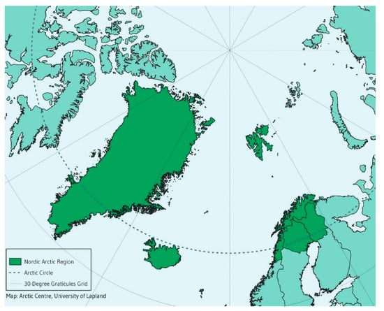 The Nordic-Arctic region, as shown in Figure 1, includes the area in deep green: the Faroe Islands, Iceland, and Greenland, as well as the northernmost regions of Finland, Norway, and Sweden.