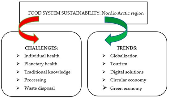 From a global perspective, the sustainability of the food system in the Nordic-Arctic region is interrelated to current challenges and trends, which are summarized in Figure 2.