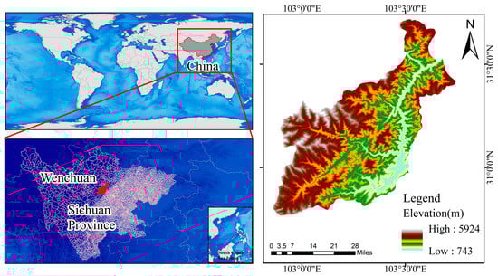 Wenchuan County (30°45′~31°43′ N, 102°51′~103°44′ E) is located in Tibetan Qiang Autonomous Prefecture of Ngawa, Sichuan Province, China. It borders Dujiangyan city and Pengzhou city in the east, Lushan County, Dayi County, and Chongzhou city in the south, Li County, Xiaojin County, and Baoxing County in the west, and Mao County in the north, with a total area of 4084 km2. The terrain of Wenchuan County tilts from northwest to southeast, with a relative elevation difference of 3000 m and an average elevation of 1326 m. The mountain of Wenchuan County is relatively steep; the terrain is relatively large, and the change of altitude affects the distribution of plant communities, thus forming different types of plant belts. The geological structure of Wenchuan County is complex; the strata are well developed, the magmatic rocks are widely distributed, and the structural transformation of the rock and soil mass is strong. The regional tectonic movement stress field causes the development of rock mass joints and fissures, lithology breakage, and structural plane development. Thus, the mechanical properties of the rock mass are greatly changed, which provides conditions for the development of geological disasters. The climate in Wenchuan County belongs to the Cw (warm temperate climate with a dry winter) in the Koppen–Geiger climate classification and decreases along with the terrain from northwest to southeast. The vertical climate zone is relatively complete, and the temperature is moderate. The average annual temperature in the area above 2000 m is 13.5~14.1 °C, the frost-free period is 247~269 d, and the rainfall is 528.7~1332.2 mm. Rivers in Wenchuan County mainly include the Minjiang River, and its tributaries are the Shoujiang River, Caopo River, and Zaguanao River. The tributaries at all levels are dendritic, rivers crisscross, and ravines crisscross. The geographical location of the study area is shown in Figure 1.