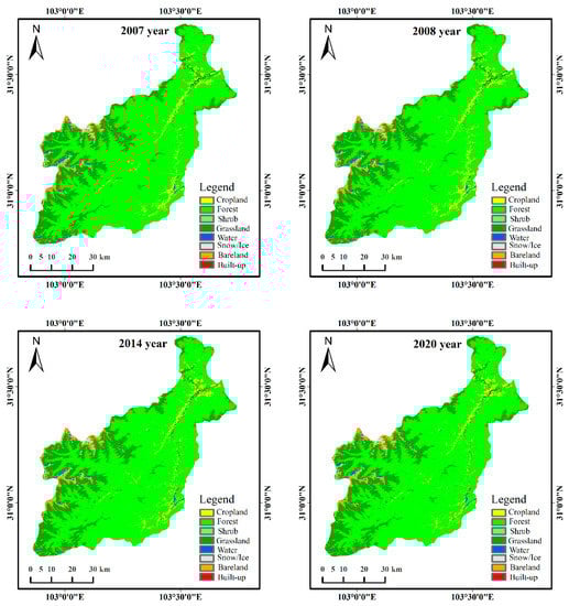 The land-use data used in this study (pre-earthquake (2007), earthquake year (2008), mid-earthquake recovery (2014), and post-earthquake recovery (2020)) were derived from the annual 30m land-use data in China produced by Professor Xin Huang’s team at Wuhan University [47] (https://zenodo.org/record/4417810#.YrpbL71BxPa (accessed on 6 January 2022)). These data were based on 335,709 Landsat images from the Google Earth Engine (GEE), combined with the automatic stabilization samples and visual interpretation samples of existing land-cover products, and the classification results were obtained by a random forest classifier. The WGS UTM projection was used as the reference frame for the analysis of this paper. Figure 2 shows the land-use data for each period in the study area.