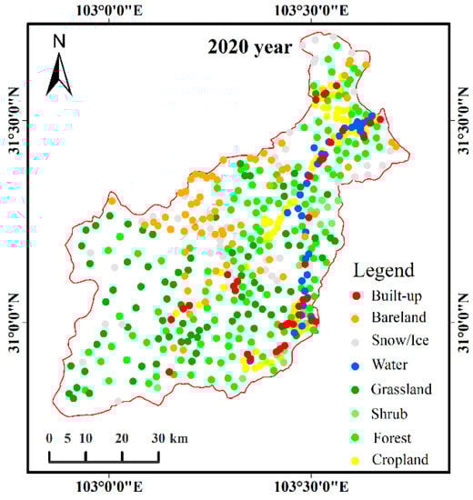 A confusion matrix is a commonly used precision evaluation method to calculate the consistency between the sample classification results and the real surface classification in the form of a matrix [48,49]. Based on the obfuscation matrix, the relevant indexes for evaluating the accuracy of the whole population and specific categories can be calculated [50]. In order to verify that the obtained land-use data met the research needs, we collected sample points in corresponding periods based on high-resolution images from Google Earth (Figure 3 is the collected sample point in 2020) and then evaluated the accuracy of the land-use data in various periods based on a confusion matrix. Table 1 shows the accuracy of the evaluation results. The results showed that the overall accuracy of the land-use data of the four periods is higher than 83%, and the kappa coefficient is higher than 0.75. According to the relationship of classification accuracy corresponding to different kappa values [51], the accuracy of the land-use data obtained in this paper is good, which me the research needs of this paper.