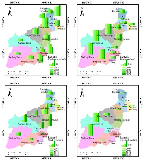 Figure 4 shows the spatial pattern distribution of the land-use area change of each township in the study area before and after the earthquake. Before and after the earthquake, the large variation of cropland type is mainly distributed in the east and north of the study area, which is also the main distribution area of cropland in the study area. Before the earthquake, the cropland area of Shuimo Town, Yingxiu Town, and Xuankou Town was 15.52 km2, 8.39km2, and 18.92 km2, respectively. Due to the comprehensive impact of the earthquake and human activities, the cropland types recovered slowly in the late earthquake period. By 2020, the cropland area was 10.67 km2, 4.70 km2, and 12.03 km2, respectively.