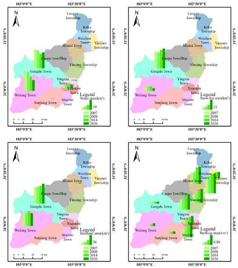 The bare land is mainly distributed in Gengda Town and Wolong Town in the study area. The bare land area mainly reflects the change of landslides. As the Wenchuan earthquake triggered a large number of landslides, Gengda Town and Wolong Town increased from 59.62 km2 and 46.83 km2 in 2007 to 60.53 km2 and 48.14 km2 in 2008, respectively. After the earthquake recovery, the bare land area of Wolong Town gradually recovered to the level before the earthquake.