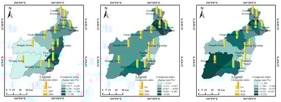Figure 5 shows the spatial pattern distribution of land-use degree before and after the earthquake at the township scale in the study area. From 2007 to 2008, due to the impact of the Wenchuan earthquake and secondary disasters, the comprehensive index of land use degree in Wolong Town showed a decreasing trend, and the land use entered a stage of decline, mainly concentrated in the severely affected areas of the study area, and the change rate of the comprehensive index was −0.046%. The comprehensive index of land-use degree in the north, east, and south of the study area showed a slight increase trend, and the regions with large change rates were mainly distributed in Yingxiu Town (3.587%), YinXing Township (1.748%), and Xuankou Town (1.347%) in the east of the study area. Due to geological disasters, some forests, grassland, and cropland in these towns were destroyed and converted into other land types, resulting in a high change rate of land-use degree. From 2008 to 2014, the comprehensive indexes of land-use degree in Yanmen Township, Weizhou Town, and Keku Township increased due to the decrease in bare land and reconstruction after the earthquake. The change rates were 0.384%, 0.695%, and 1.132%, respectively. These towns are located in the northeast of the study area, and their economic development level is relatively good, which is of great help to the reconstruction and construction after the earthquake. From 2014 to 2020, the comprehensive indexes of land-use degree in towns and townships are basically in the rising development stage. The regions with large change rates of the comprehensive indexes are mainly distributed in Gengda Town and Keku Township, with change rates of 0.520% and 0.464%, respectively. This is mainly due to the increase in built-up and cropland area and the decrease in bare land area. The natural restoration of vegetation and the construction of urbanization are conducive to the improvement of land use degree, and the ecological system of each township gradually tends to have a stable development.