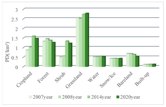 Figure 6 shows the temporal variation trend of the landscape patch density index before and after the earthquake. Compared with 2007, the PD of most landscape types in the study area showed an increasing trend after the earthquake, indicating that the degree of regional landscape fragmentation was intensified, landscape heterogeneity was increased, and the ecological environment was significantly worse due to the earthquake. From 2008 to 2014, the PD values of cropland, shrub, and grassland types changed dramatically, indicating that regional landscape fragmentation caused by earthquakes and secondary geological disasters was serious. PD values of forest and bare land landscape types decreased, indicating that vegetation recovery was good during this period. From 2014 to 2020, the regional PD value basically decreased slightly compared with the previous period. The PD of the built-up type increased slightly, which may be related to the mass production and construction activities carried out during this period. In conclusion, affected by earthquakes and secondary geological disasters, the PD values of all landscape types in the study area changed strongly, especially bare land and some vegetation types, which should be paid more attention to in future ecological environment restoration.