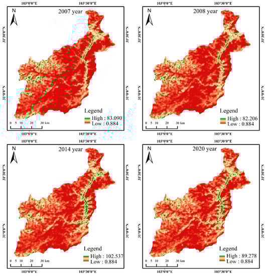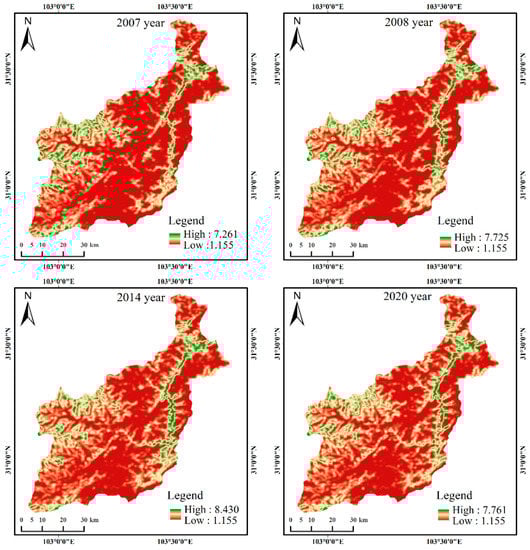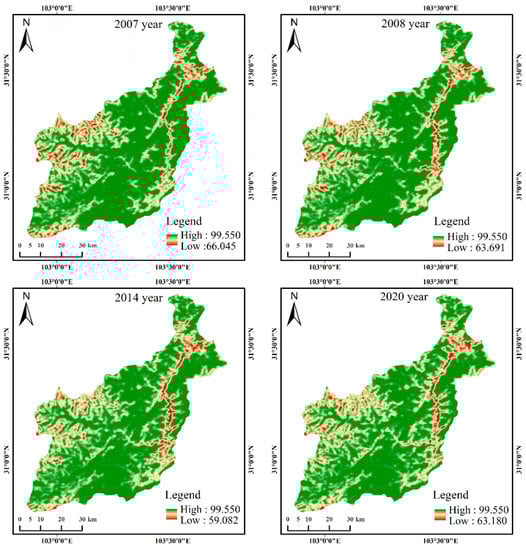 Figure 8 shows the temporal variation trend of the landscape aggregation index before and after the earthquake. Before the earthquake, the aggregation degree of various landscape patches in the study area was at a high level, and the aggregation degree of forest land was the largest, reaching 97.43, which dominated the AI of the whole region. The AI values of landscape types showed a downward trend from 2007 to 2008, indicating that the connectivity between landscape patches was low and patches were discrete. From 2008 to 2020, most of the landscape classes AI increased significantly, the bare land and built-up is most obvious, the two strong regional landscape type affected by human activities, show that artificial restoration measures of ecological environment recovery has a positive effect, and enable the ecological environment to recover quickly, at the same time it shows that during the earthquake the regional ecological environment experienced benign development.