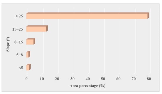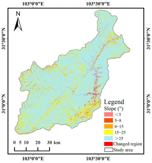 In order to study the distribution of land-use change under topographic factors, this paper took slope as an example to obtain the slope data of the study area and divided the slope into five grades according to the topography of the study area (<5°, 5–8°, 8–15°, 15°–25°, >25°). Then, the land-use change in the study area was superimposed with the slope data to analyze the distribution of land-use change before and after the earthquake (2007–2008) (Figure 12 and Figure 13). The results showed that from 2007 to 2008, the largest region of land-use change was mainly distributed in the east and north of the study area, and the slope range was more than 25°. The percentage of the change area to the total change area was 79.10%. The second is the region with a slope of 15–25°, and the percentage of land-use change area in the total change area is 12.97%. The area of land-use change was the smallest in the region, with a slope of 5–8°, and its area percentage was only 1.42%. The reasons for the above phenomenon may be that in the region with a slope of <8°, rivers are the main factors, and land use is not easy to change. Therefore, land-use change in the region with a slope of <8° is small. However, the region with a slope of >25° has complex surface types, such as relatively frequent human activities around cropland and built-up, which will also cause land-use changes. In addition, slope is an important factor leading to landslide and subsequent restoration of land-cover types (especially vegetation) [57,58]. Previous studies have shown that landslides are most likely to occur within a slope range of 20–50° [59,60]. This indicates from the side that the disturbance of earthquakes to surface vegetation is mainly reflected by landslides.