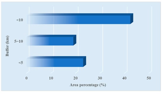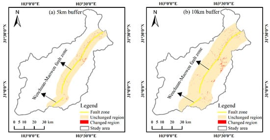 In this paper, based on the existing research results [61,62,63], the Wenchuan–Maowen fault zone in the study area was taken as the center to quantitatively express the change rule of land use before and after the earthquake within 5 km and 10 km regions (Figure 14 and Figure 15). The results show that the percentage of land-use change within 5 km of the Wenchuan-Maowen fault zone is 23.23% of the total land-use change area, and the land-use change area is mainly distributed in the northeast of the study area. The percentage of land-use change area within 5–10 km accounted for 19.22% of the total land-use change area, which was mainly distributed in the east and northeast of the study area. The results show that due to the influence of the Wenzhou–Maowen fault zone, the proportion of land-use change in the region closer to the Wenzhou–Mawen fault zone is higher, indicating that the degree of land damage is more serious. Therefore, in the development of land-use resource planning, areas within the fault zone should be avoided in order to reduce the effect of earthquakes on buildings, human life, and property, which cause heavy losses.