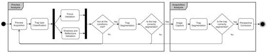 In order to automatically acquire both delta traps (DT) and chromotropic traps (CT) images, each preview frame must meet the requirements of four different modules: (i) focus validation; (ii) trap-type classification; (iii) shadows and reflection validation; and (iv) trap segmentation. When a set of consecutive frames passes those conditions, an image is automatically acquired, and a perspective correction step that relies on the corners of the detect trap segmentation mask is applied. To develop and validate these different algorithms, we collected and manually annotated a dataset of 516 DT and CT images. The dataset was divided into three subsets: image focus subset, reflections/shadows subset, and trap segmentation subset. The proposed approaches achieved an accuracy of 84% regarding focus assessment, an accuracy of 96% and 80% regarding the shadows and/or reflections on CT and DT traps, respectively, and a Jaccard index value of 97% for the segmentation approach [].