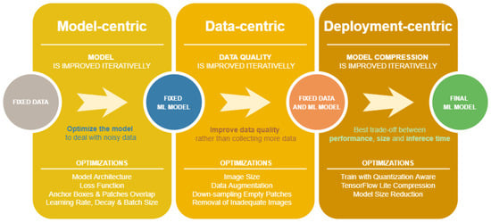 The main goal of this module is to support winegrowers by automatically detecting and counting key insects on conventional sticky traps (CT or DT) via mobile devices. In particular, the previously developed computer vision approach is based on lightweight deep object detection networks, suitable to be deployed and run locally on smartphones. The methodology behind the development of this model involved the exploration of five different object detection deep learning models, namely the following: (i) SSD ResNet50 (RetinaNet50); (ii) Faster R-CNN ResNet101; (iii) EfficientDet-D0; (iv) SSD MobileNet V2; and (v) CenterNet ResNet50. For benchmarking purposes, three groups of optimization strategies were considered: model-centric, data-centric, and deployment-centric. Each group comprised different types of optimizations, executed and assessed iteratively, as detailed in Figure 2.