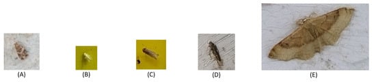 The automated detection comprised the identification and counting of three key insects for viticulture, specifically the European Grapevine Moth, Green Leafhopper and “Flavescence Dorée” Leafhopper. Moreover, the Tomato Moth and Morphotype C (Idaea degeneraria) were also included, as they are usually caught in delta traps and can be confused with the Grapevine Moth (Figure 3).