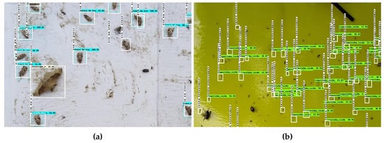 Examples of detections predicted by SSD Resnet50 model on test set images of (a) delta trap; (b) yellow sticky trap. The groundtruth annotations are marked in white, while GM predictions are in blue, MC in beige and GL in green [].