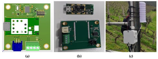 Regarding electronics, we selected the platform Kallisto® (generation 2) [], a commercial solution that allows integration with different sensors. In this platform, we integrated the environmental sensor Olimex BME280, which consists of a printed circuit board (PCB) with an integrated Bosch BME280 sensor []. We also had to develop a expansion board that would allow to gain access to the I2C pins, battery power pins and add an real-time clock (RTC) chip to Kallisto (see Figure 5a,b). The EoT sensor uses a battery of 2000 mAh, which theoretically allows an autonomy that covers a complete viticultural season (about 10 months) with a single charge.
