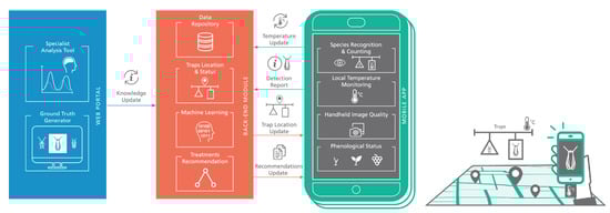 To develop such a system, we started by performing user-centered research for requirements and functionalities definition (see Section 3.1). This knowledge enabled us to delineate the system architecture and its main components, namely: (i) Image Acquisition Module; (ii) Insects Detection Module; (iii) Sensorization Module; (iv) Mobile Application; (v) Online Image Annotator (ground truth generator); and (vi) Web Portal.