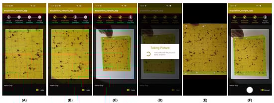 Image Acquisition Module screenshots: (A) unfocused image; (B) focused and good illumination; (C) trap detected; (D) automatic image capture; (E) perspective correction; and (F) manual mode [].
