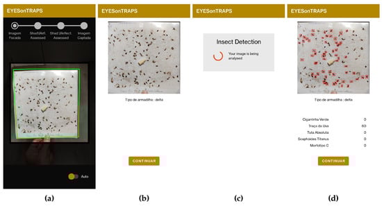 Insects Detection Module screenshots: (a) automatic image capture; (b) perspective correction; (c) image processing; and (d) output image with insects location and respective counting.