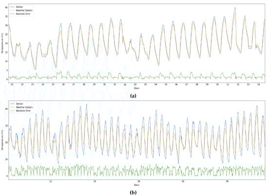 Temperature readings for EoT sensors: (a) near a weather station (EoT Sensor 1); (b) distant from a weather station (EoT Sensor 6). The EoT sensor data are depicted in blue, the weather station data in orange and the absolute error between them in green.