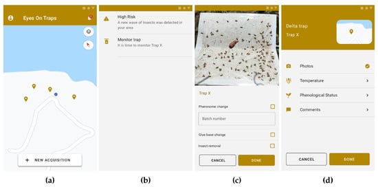 Mobile application screens: (a) main screen; (b) notifications screen; (c) trap information screen; (d) tasks available for each acquisition.