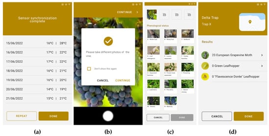 Mobile application screens: (a) temperature synchronization; (b) phenological status image acquisition; (c) phenological status selection; (d) automated insects detection.