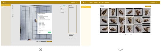 To develop the insects detection module via supervised machine learning approaches, it was necessary to train computer vision algorithms with data manually labeled by taxonomy specialists. Therefore, an online image annotator was developed to generate the ground truth data required to train the AI algorithms. It consists of a web tool platform accessible via the internet, protected by user authentication, and each user may have two different roles: (i) annotator: usually a taxonomy specialist that accesses the platform for image annotation purposes; or (ii) supervisor: serves as administrator of the platform, being able to create/delete users, attribute specific traps to annotators, import/export data, etc. With this solution, it is easy for personnel with technical knowledge to contribute and support the development of the EyesOnTraps system by marking key insects on trap images and specifying the respective species (Figure 12a), as well as easily reviewing the attributed annotations by species (Figure 12b).