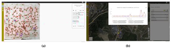 Geographic representation of elements relevant to the management of open-field grape production (Figure 14a), such as (i) geographic delimitation of grape parcels; (ii) location of deployed sticky traps; or (iii) location of EoT sensors and weather stations. It is also possible to interact with these elements and consult additional information, such as grape varieties present in each parcel, history of trap images collected via the mobile application for each sticky trap location (Figure 14b), or temperature readings for each sensor location.