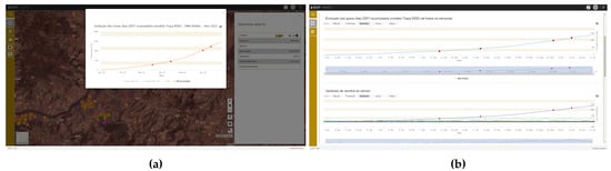 The Web Portal also enables the visualization of the phenological stage of the vineyard registered via the mobile application, as well as editing/correcting the information associated with the acquisitions. It is also devised to incorporate and display the outputs of phenology prediction models based on DD to predict pest flights, such as the model developed for the European Grapevine Moth [] already integrated in the system (Figure 16a). The temperature data that feed these models are collected via the EoT sensors or commercial weather stations, being that the communication with both types of equipment are already available on the system.