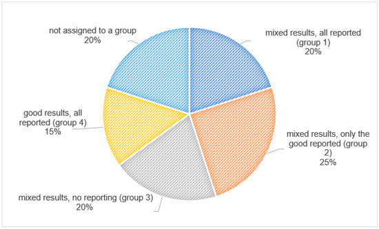 Additionally, we observe differences in the reporting strategy of companies that have received similar ratings from rating agencies. Companies are divided into four groups to identify the effects of the different integrations in corporate reporting on stakeholder groups. Group 1 includes companies that have mixed ESG rating results and explicitly integrate all rating results into their annual or sustainability reports. Group 2 comprises companies that have mixed ESG rating results but integrate only the strong results (at least an ‘A’ or a ‘low risk’ result) into their annual or sustainability report. Group 3 contains companies that have mixed ESG rating results and integrate none of the results into their annual or sustainability reports. Finally, Group 4 involves companies with only strong ESG rating results (that receive at least an ‘A’ or a ‘low risk’ result) and explicitly integrates all their results into their annual or sustainability report. Figure 2 shows how the companies can be assigned to the four groups, with eight of the 40 companies not being assigned to any of the four groups.