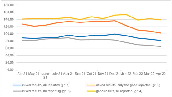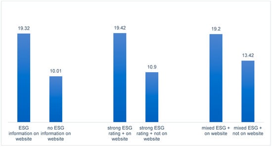 In order to measure the effect of disclosing ESG rating results in corporate reporting on non-professional stakeholders, we consider that they might not read the companies’ annual and sustainability reports due to time restrictions or their insufficient ability to process and evaluate such information [34,35]. Therefore, the literature suggests not using the websites of companies as a common channel for decision-making by non-professional stakeholders [96,97,98]. Thus, we add hand-collected ESG rating information from the websites and press releases of DAX40 companies to our sample of non-professional stakeholders and group the companies according to their disclosure of ESG rating results on their company websites. Figure 5 illustrates the average net reputation scores of DAX40 companies grouped by their reporting of ESG rating information on their websites.