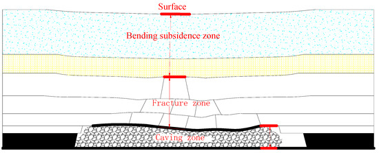 According to the “masonry wall” theory [21], the rock morphology of a coal mining face after using the caving method is divided into “three zones”, that is, the working face is divided into a caving zone, fracture zone, and bending subsidence zone, as shown in Figure 2.