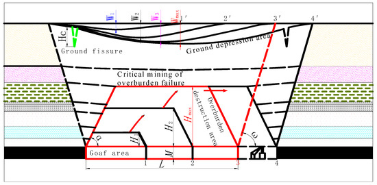 When the working face size is greater than the critical size, the rock damage is fully exploited, and vice versa. In order to further analyze the criterion of full mining caused by erosion rock damage, the erosion rock damage area is further simplified as a trapezoidal area, and the mined-out area is simplified as a rectangular area. As shown in Figure 3, the surface subsidence area (W1, W2, W3, Wmax) increases with the increase of the opening depth (H1, H2, Hmax). With the working face advancing distance (L), based on the two-dimensional plane conservation law, the theoretical calculation formula of erosion rock damage height (Hmax) under full mining caused by erosion rock damage can be obtained [31]:
