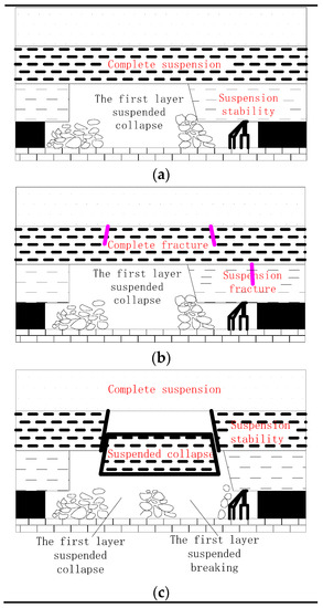 Damage transmission process of overlying rock [31]: (a) suspension stability; (b) suspension fracture; (c) suspension breaking.