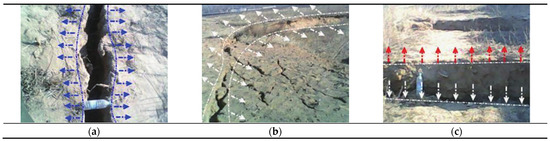 Main types of ground fissures [31]: (a) tensile ground fissures; (b) collapse ground fissures; (c) sliding ground fissures.