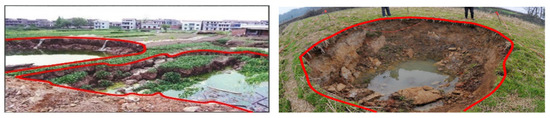 (2) Collapse pits. When the roof caving area of a mined-out area is large, the rock damage is transmitted upward, and the surface damage is often manifested as a collapse pit, as shown in Figure 6. The formation of collapse pits is often relatively rapid, accompanied by a relatively large energy release. In some engineering examples of surface damage forms, the main damage form is collapse pits.