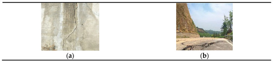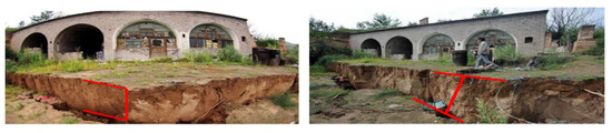 (2) Surface building (structures) damage. Surface buildings are basically loaded on the surface in the form of foundations. According to the damage transmission mechanism to the surface, when the coal mining is carried out, the damage of the overlying strata is transmitted to the surface, and the original bearing stress of the surface building (structure) will change [3,38,39]. When the bearing capacity exceeds the bearing limit, the surface subsidence will lead to the destruction of the surface structure, as shown in Figure 10a. It has the characteristics of a wide range and great harm, which seriously threaten people’s lives and security.