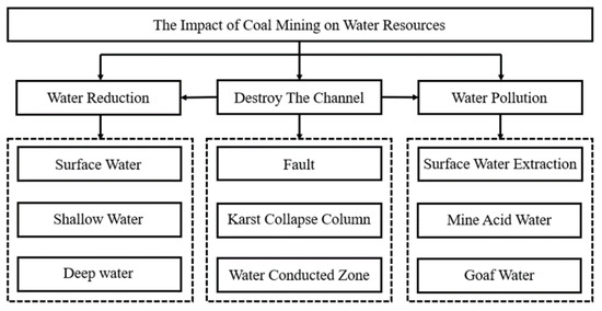 The process of underground mining will also lead to the destruction of the underground rock structure and the formation of ground fissures, which will not only destroy the root system of vegetation and make plants wilt or decay, but also drain surface water and spring areas, leading to the decline of groundwater levels (Figure 9) [4]. The destruction of land resources and water resources, as well as soil erosion and other issues brought about by this, will greatly affect the surface ecological environment. In particular, in the semi-arid region of northwest China, the primary surface ecological environment system is fragile, and underground mining activities often cause the decline of the primary ecosystem [37].