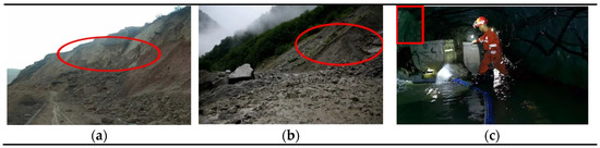 (3) Mine geological disasters. In addition to direct surface geological disasters, such as collapsed pits, steps, and ground fissures caused by surface damage, secondary geological disasters such as landslides and collapse debris flows are also prone to occur, due to the chain reaction caused by the change of surface mechanical properties [41], as shown in Figure 11. In the process of surface damage, the original geological structure of the rock and surface change, and the original stress and original landform change. When the landslide instability occurs, the slope collapses and collapse accidents occur. Affected by rainfall, the surface is more prone to instability, namely the formation of debris flow. In the process of underground mining, serious rock damage can be caused, and rock damage will lead to deformation of roadway engineering and wellbores. Surface water enters the mining area through ground fissures and mining fissure channels, especially in the rainy season, which greatly increases the accident rate of roof water inrush and affects the safety of mine production [42,43,44].