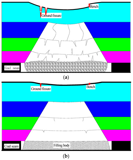 (1) Filling mining. The essence of filling mining involves replacing the mined coal seam with filling materials. The existing mainstream replacement materials include solid, paste, and (ultra) high water filling. Among them, the most commonly used filling methods are solid filling and paste filling, accounting for 58% and 30% of the total number of filled mines, respectively. High water and (ultra) high water filling only account for 8% and 4% of the total number of filled mines, respectively. According to the relevant research, a mining face filled with filling materials will not have obvious strata behavior, which can effectively support the overlying strata and control surface subsidence. This is an ideal mining method [20,45,46]. A filling process diagram of a mined-out area is shown in Figure 12. When a mined-out area is not filled, there are obvious “three zones” characteristics of fissures and steps, while there are almost no fissures and steps in the upper strata and surface of the working face. The filling working face mining can effectively inhibit the development of fissures and steps.
