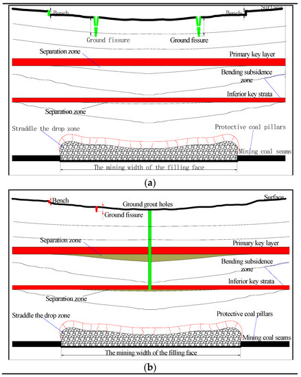 (2) Separation grouting technology. Separation grouting technology is a technology that injects grouting material into the separation space by drilling from the surface to the overburden separation zone. The main technical principle is shown in Figure 13b. As shown in Figure 13a,b, the damage of ground fissures and steps is significantly reduced by grouting the separation zone below the main key strata. According to the key strata theory, the main key strata plays a control role in the upper strata, and grouting should be avoided along the water flowing fractured zone into the mining space, which affects normal production. Therefore, the position of grouting should be above the water flowing fractured zone, and the separation zone should be below the main key strata [49]. After injecting into the separation zone, the grouting material is solidified within a certain period of time, so that part of the load of the overlying strata is transferred to the caving gangue in the mined-out area, through the filling body, which can effectively receive and carry the load [50]. This technology is not only simple and easy to operate, but also can effectively support the overlying strata, reducing the transmission of the effect of mining to the ground and reducing surface subsidence.