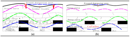 (1) Coordinated mining. Coordinated mining uses two or more adjacent working faces to maintain a certain advancing relationship in practice, so as to offset part or all of the surface deformation. It can be divided into coordinated mining and symmetrical mining of two coal seams (layered), or multiple working faces in the same coal seam [51]; for example, the most basic multi-coal pillar coordinated mining, as shown in Figure 14. The protective coal pillars left in the adjacent mining coal seams are staggered in their spatial relationship, so that they are not on a plane and jointly support the overlying strata erosion pressure. It can be seen from a comparison between Figure 14a,b that when the protective coal pillar is arranged on a plane, the supporting stress distribution of the protective coal pillar is uneven, and there is obvious shear stress, while the overlying strata have “three zones” and the overlying rock is seriously damaged, which is accompanied by huge collapse pits and ground fissures on the surface. When a protective coal pillar is not in a plane, the support stress distribution of the protective coal pillar is uniform, there is no obvious shear stress, and the rock is effectively supported. The surface fluctuation is small, it is not easy to form collapse pits, and there are almost no fissures.