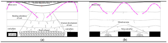 Strip mining can effectively recover part of the coal resources and has a good protective effect on the upper surface buildings in the mining area, but its recovery rate is low. As shown in Figure 15, coal seam mining is mainly arranged under surface buildings (structures). Through the comparison of Figure 15a,b, it can be seen that the support stress distribution of strip mining is uniform, and destruction of overlying strata and surface subsidence are not obvious. However, compared with other mining methods, a large part of the coal seam is left as a coal pillar, and the mining rate is not high, which has certain limitations. The coordinated mining method, combining strip mining and filling mining, namely, the “strip mining roadway backfilling” method, can effectively improve the mining rate and even realize the full mining of coal mines in the mining area [53].