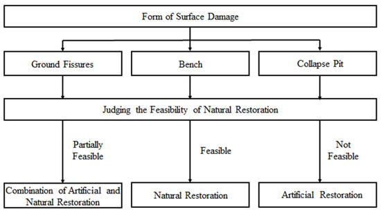 Restoration after land destruction is mainly divided into natural restoration and artificial restoration. Previous studies have mostly focused on artificial restoration, but recently, the feasibility of natural restoration in mining areas after land destruction has been paid increased attention. The idea of surface damage repair in Chinese mines is considered in Figure 16. After surface damage, the feasibility of natural repair of the surface damage is judged based on the different forms of damage. If it is feasible, the implementation of natural repair can be carried out, and if it is not feasible, artificial repair is utilized, as well as some feasible implementation of a combination of the two repair methods.