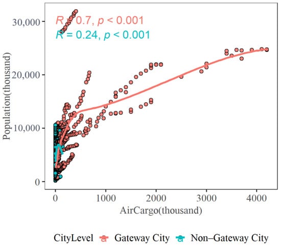 Before analyzing the data, the relationship between the variables can be understood through a bivariate scatter plot, as shown in Figure 1, Figure 2, Figure 3 and Figure 4. The gateway cities in the figure are the 35 large- and medium-sized cities consisting of Chinese municipalities, sub-provincial cities, and other provincial capitals. If the city in the sample is among these 35 large- and medium-sized cities, the city is ranked as a gateway city; otherwise it is defined as a non-gateway city. For the convenience of description, the total import and export trade in the figures and tables of this paper will be expressed as Trade, the size of the resident population as Population, and the total employment as Employment. The results presented in Figure 1, Figure 2, Figure 3 and Figure 4 show that China’s air cargo is mainly distributed in gateway cities, and air cargo seems to show a more obvious contemporaneous correlation with total import and export trade and total employment.