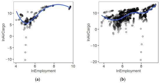 Scatter plot of ln(air cargo) and ln(Employment): (a) Southwest China; (b) excluding Southwest China.