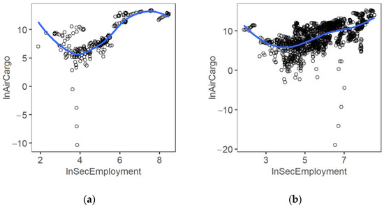 Scatter plot of ln(air cargo) and ln(secondary employment): (a) Southwest China; (b) excluding Southwest China.