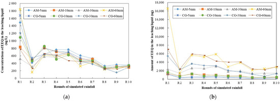 From the leaching concentration alone, it seems that the precipitation intensity had some influence on SE loss, and light rainfall was more likely to result in the leaching out of high concentrations of EEQ. By comparing the AM with the CG (control group), the effect of enhanced microorganisms on the leaching concentration of SEs was not significant. However, we can get more information from the variations in the SE leaching amount. Figure 2b showed that the greater the rainfall, the greater the loss of SEs, and the difference was obvious, but the effect of enhanced microbial action could not be determined.