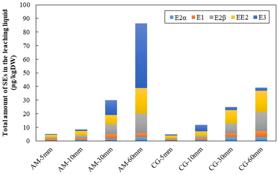 Before the experiment, the moisture content of the manure was 83.9%, the average particle size was 122.7 μm, and the nitrogen, phosphorus, and organic matter contents were 26.0 g/kgDW, 6.1 g/kgDW, and 589 g/kgDW, respectively. After the experiment, the average particle size was 141.6μm, the nitrogen, phosphorus, and organic matter contents were 24.1 g/kgDW, 6.6 g/kgDW, and 646 g/kgDW, respectively. The raw contents of E2α, E1, E2β, EE2, and E3 in dairy manure before the open-air compost experiment were 766.74 μg/kg, 889.89 μg/kg, 525.84 μg/kg, 1479.07 μg/kg, and 1000.07 μg/kg of dry weight (DW), respectively. Throughout the experimental period, the amounts of five SEs were 0.37–2.78 μg/kg, 0.69–4.51 μg/kg, 0.98–14.18 μg/kg, 1.98–18.90 μg/kg, and 0.61–47.47 μg/kg, respectively, as indicated in Figure 3. Composting can affect estrogen concentrations, with composting reported to remove steroid estrogen in manure at efficiencies ranging from 79 to 87% [,]. From the perspective of loss quality composition, E3 loss was highest, followed by EE2 and E2β, while E1 and E2α were the least likely to be lost. It is worth noting that in the experimental group AM-60 mm, the loss of almost all SEs was the highest (except for E1); the loss of E3 was especially prominent.