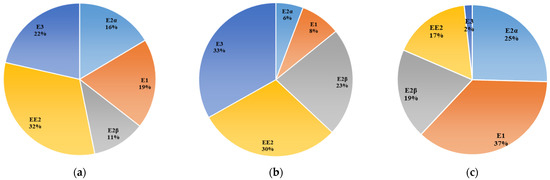 Occurrence ratio of SEs in raw dairy manure, leaching liquid, and composted manure ((a). raw manure; (b). leaching liquid; (c). composed manure).
