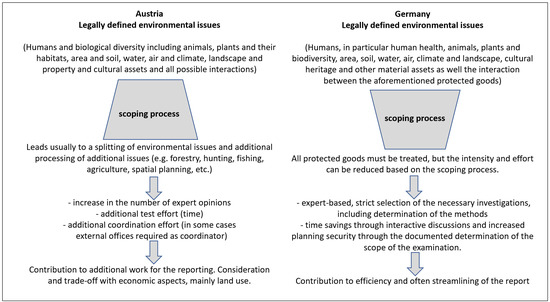 The differences between the two countries are visualized in Figure 1. The pre-process in Austria does not preclude that the number of environmental issues and additional aspects may be expanded during the following process, whereas in Germany the possible number of issues to be assessed is reduced to those which are perceived as crucial and significantly affected.